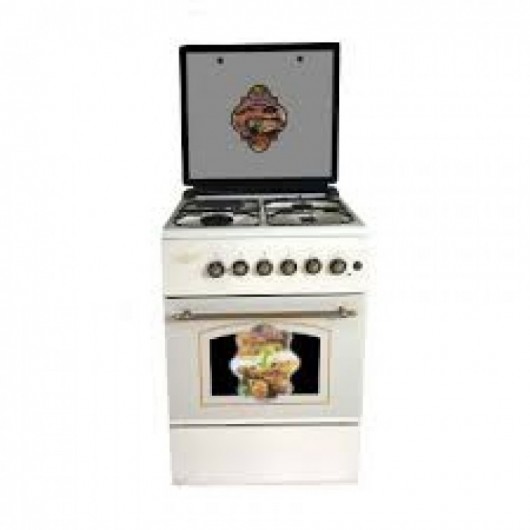 0x60 CREAM COLOUR FREE STANDING OVEN, 3 GAS + 1 HOT PLATE, EURO POOL BURNERS, GAS OVEN, GAS GRILL, TWO ADJUSTABLE LEGS, GOLD RISTIQ BUTTON AND HANDLE, PUSH BOTTON IGNITION FOR HOBS